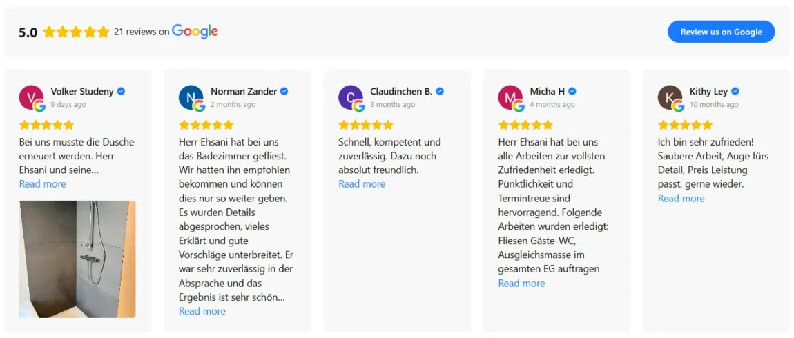 Fliesen Ehsani ist ein renommierter Meisterbetrieb, der in Niederkassel, Bonn, Siegburg und der umliegenden Region tätig ist. Seit der Gründung unseres Unternehmens verfolgen wir einen ganzheitlichen Ansatz und bieten unseren Kunden eine vielfältige Palette an hochwertigen Dienstleistungen. Dabei legen wir großen Wert auf Präzision, Qualität und individuellen Service, um Ihren Anforderungen gerecht zu werden. Kontaktieren Sie uns noch heute, um mehr über unser Leistungsangebot zu erfahren und einen unverbindlichen, kostenlosen Kostenvoranschlag zu erhalten.